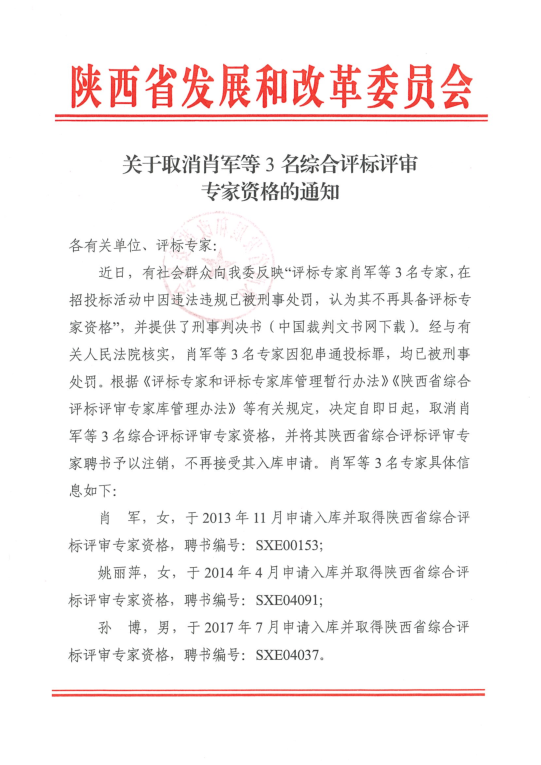 關(guān)于取消肖軍等3名綜合評(píng)標(biāo)評(píng)審專家資格的通知
