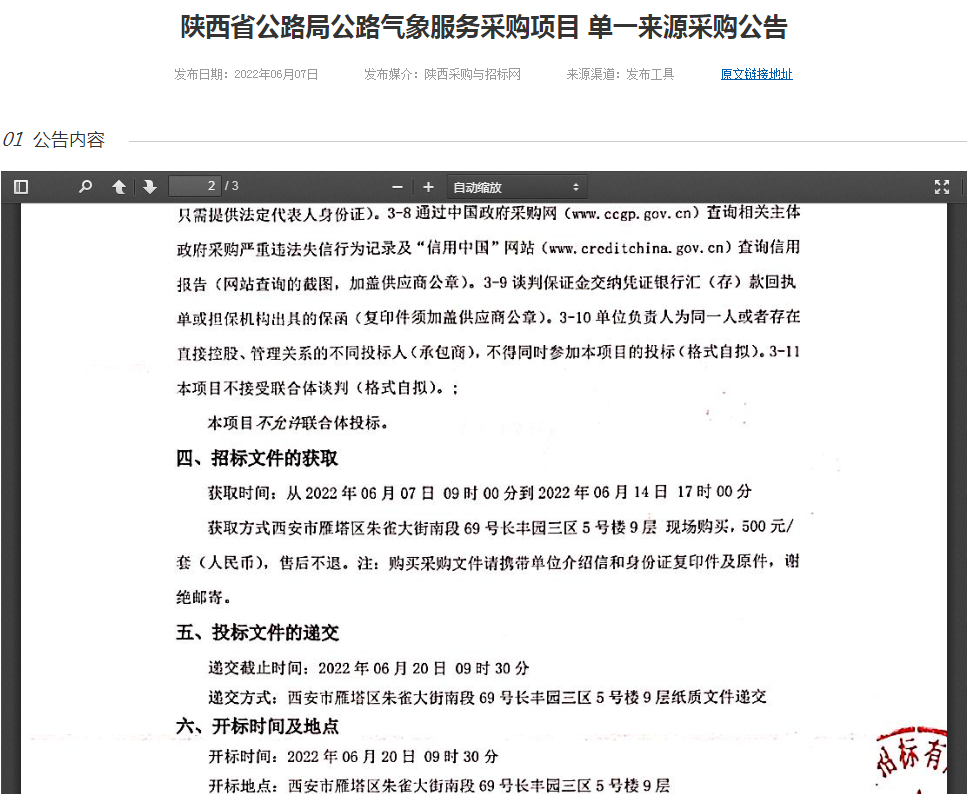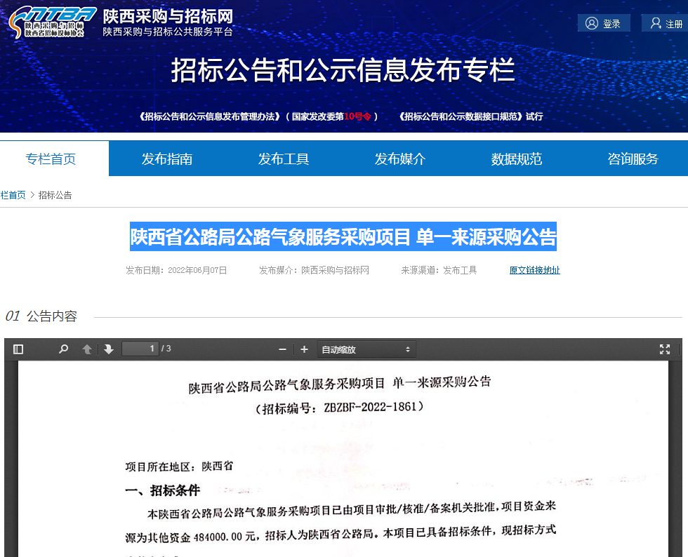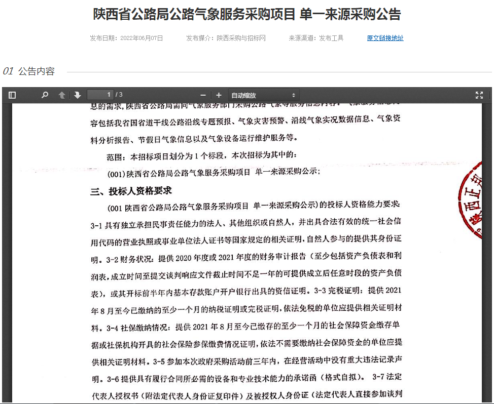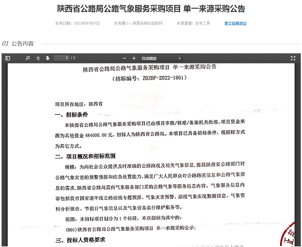 陜西省公路局公路氣象服務(wù)采購(gòu)項(xiàng)目 單一來(lái)源采購(gòu)公告