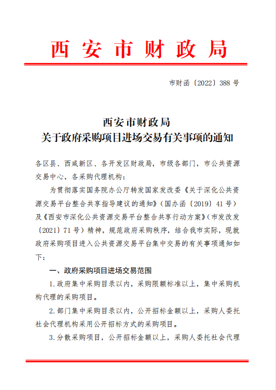 西安市財(cái)政局關(guān)于政府采購項(xiàng)目進(jìn)場(chǎng)交易有關(guān)事項(xiàng)的通知
