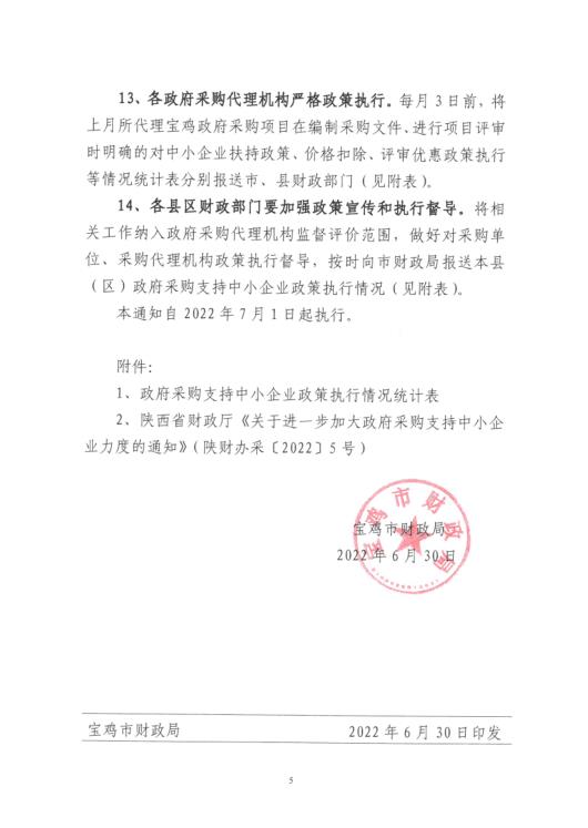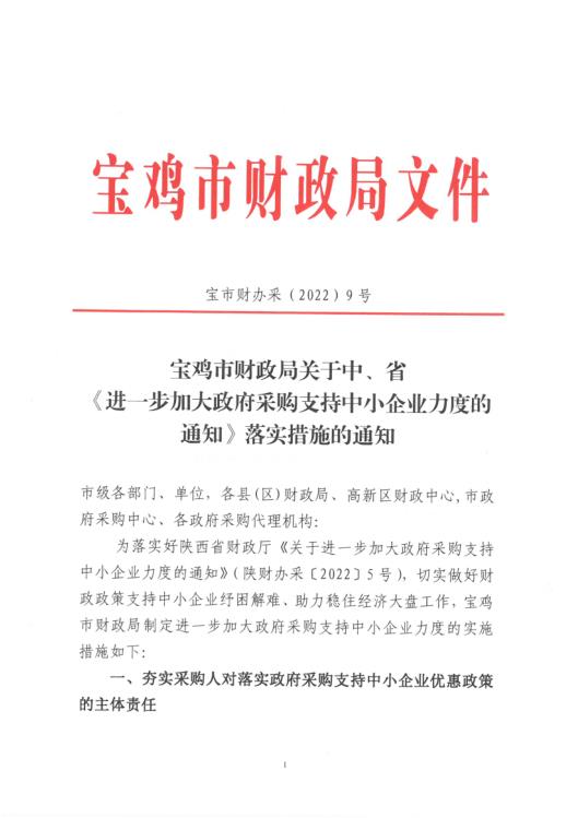 寶雞市財政局關于中、省《進一步加大政府采購支持中小企業(yè)力度的通知》落實措施的通知