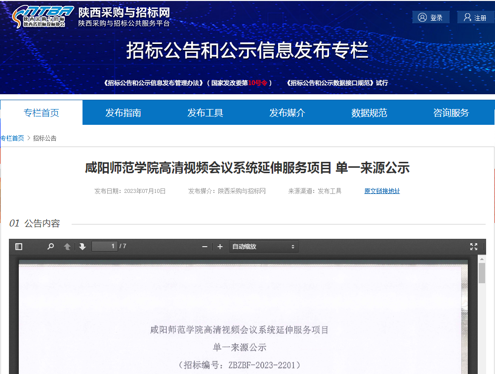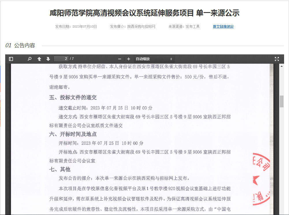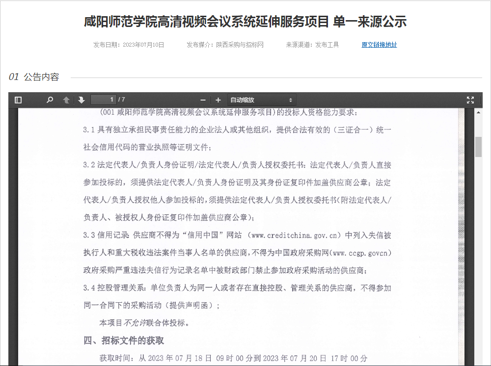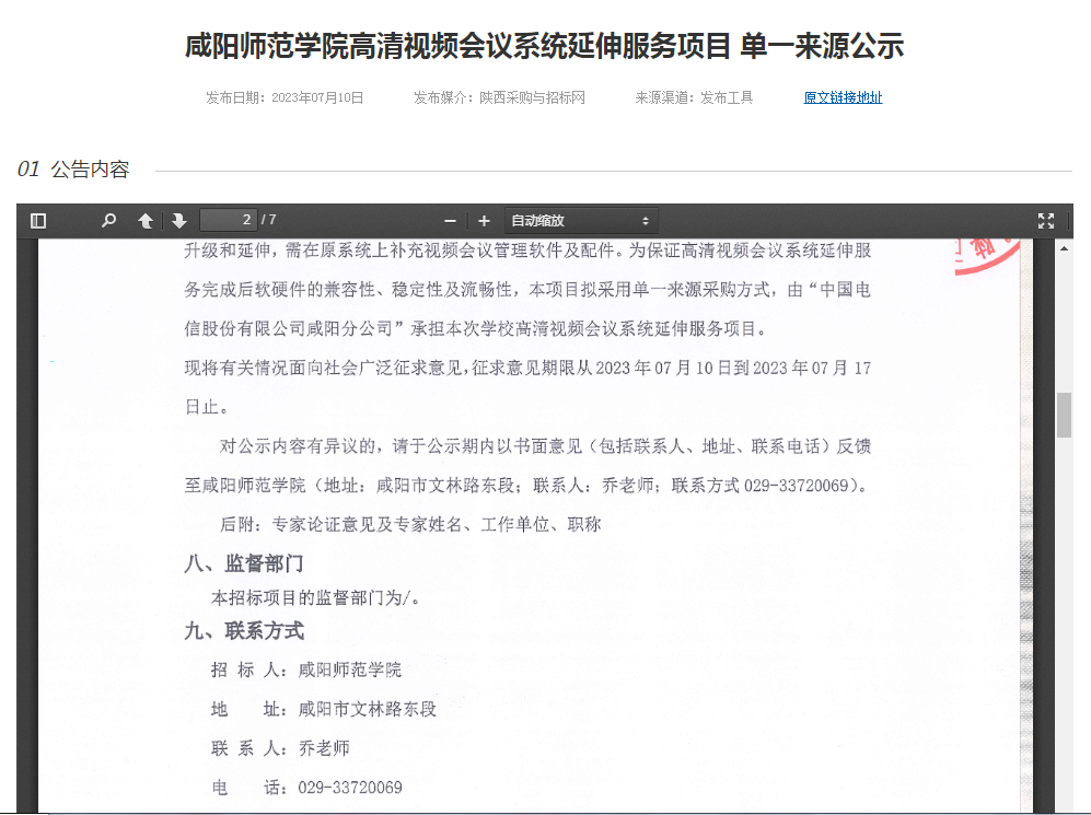 咸陽(yáng)師范學(xué)院高清視頻會(huì)議系統(tǒng)延伸服務(wù)項(xiàng)目 單一來(lái)源公示